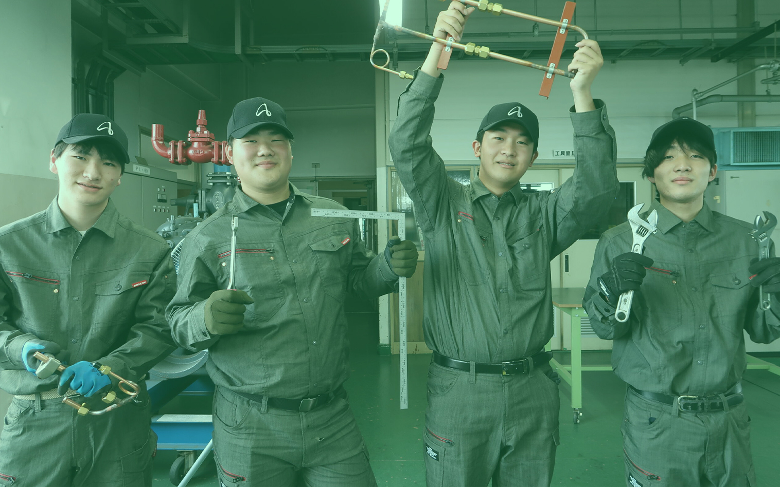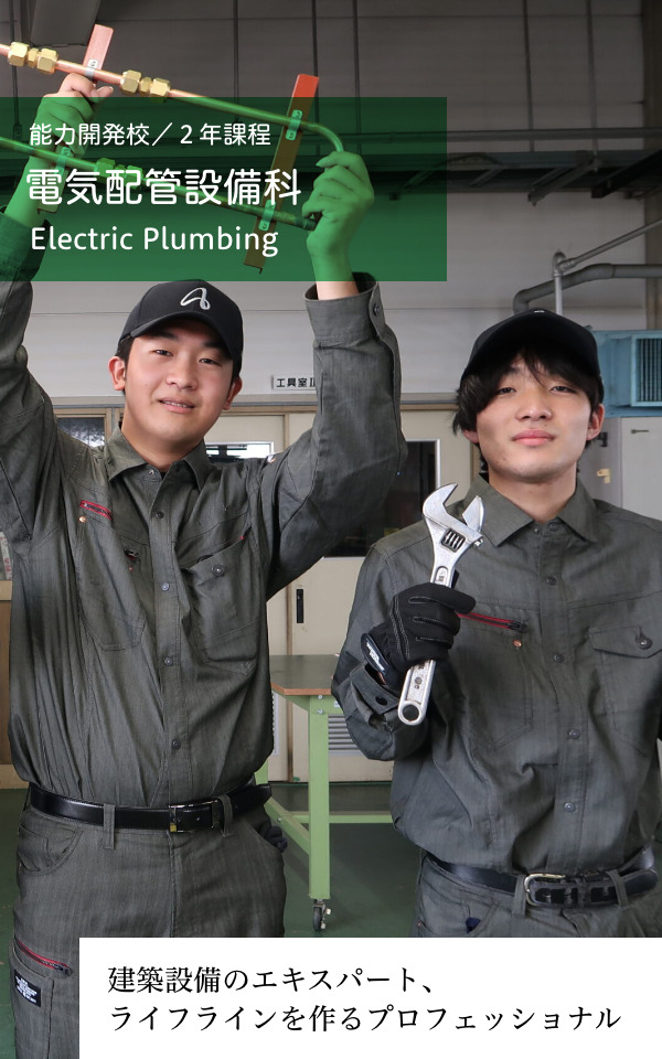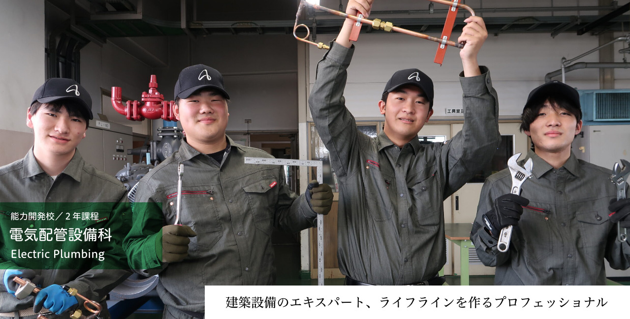 電気・冷凍空調・給排水衛生設備の設計・施工技術を習得するとともに、再生可能エネルギー分野に関する施工、メンテナンス技術についても学び、建設設備業界で活躍できる人材を育成します。