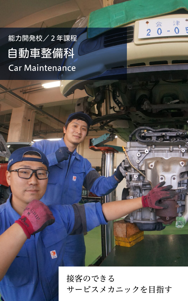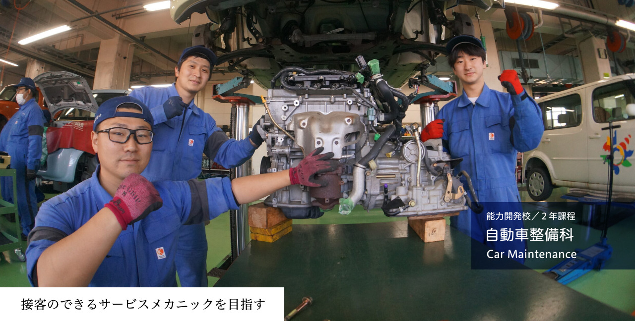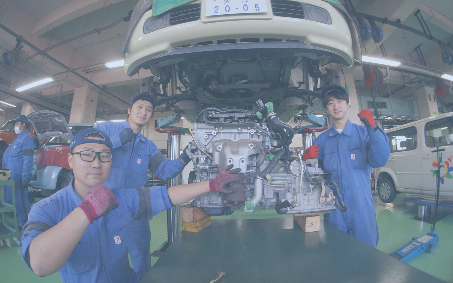 自動車各部構造の理解と整備技術を基本から身に付けるとともに、ハイブリッドやEV、エコカーの整備にも対応できる人材を育成します。 (国土交通省「二級自動車整備士養成施設」)